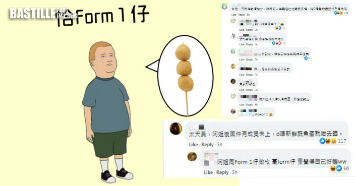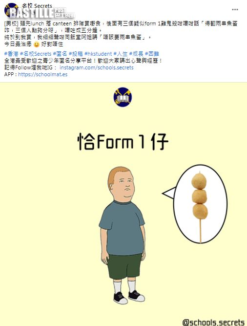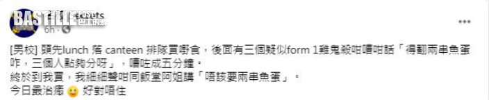 相信是一位就讀男校的網民在Facebook專頁表示,「頭先lunch 落 canteen 排隊買嘢食,後面有三個疑似form 1雞鬼殺咁嘈咁話『得翻兩串魚蛋咋,三個人點夠分呀』,嘈咗成五分鐘。終於到我買,我細細聲咁同飯堂阿姐講『唔該要兩串魚蛋』。」