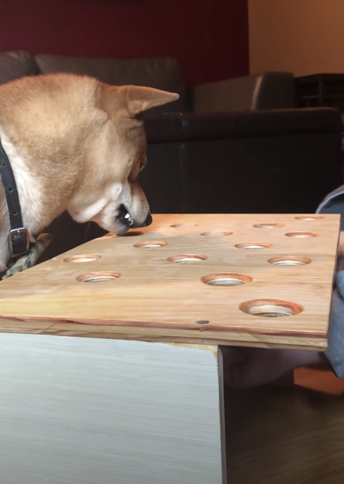 ▼主人為了跟Fizzgig玩「香腸版打地鼠遊戲」,特別製作了一張木桌,並在桌面上挖了一個個小洞。主人將美味的香腸探出小洞,讓Fizzgig來吃。Fizzgig專注地盯著香腸可能出沒的洞口,發現香腸後就迅速張嘴咬下去,但主人比牠更快,牠每次都慢一步,眼睜睜看著香腸從嘴邊溜走。
