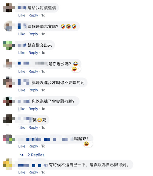 這篇貼文曝光後,立刻就引起了上萬網友圍觀,紛紛爆笑留言說「哈哈哈哈有信心是好事,但真的可以放棄了,有時候歌喉是天生的,再練也不會變蕭敬騰」、「你的進步不需要他人陪葬」、「笑死,給年輕人一個機會吧」、「鄰居:去你的進步,進步了再唱」、「沒有已讀不回,很有誠意啊」、「看完之後有點消氣了呢」、「哈哈哈我以為是勵志文!」