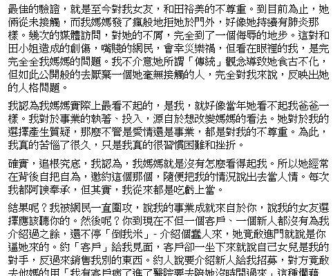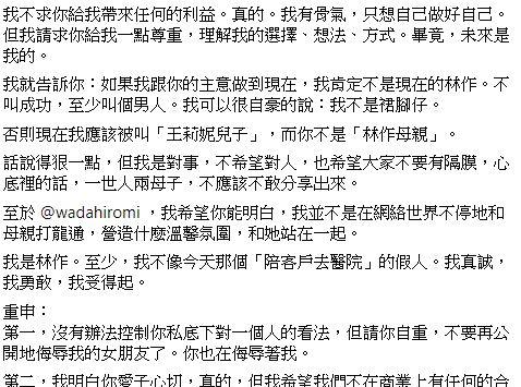 最後林作聲明:「我不求你給我帶來任何的利益。真的。我有骨氣,只想自己做好自己。但我請求你給我一點尊重,理解我的選擇、想法、方式。畢竟,未來是我的。我就告訴你:如果我跟你的主意做到現在,我肯定不是現在的林作。不叫成功,至少叫個男人。我可以很自豪的說:我不是裙腳仔。否則現在我應該被叫「王莉妮兒子」,而你不是「林作母親」。話說得狠一點,但我是對事,不希望對人,也希望大家不要有隔膜,心底裡的話,一世人兩母子,不應該不敢分享出來。」,又直接拒絕任何合作,「我明白你愛子心切,真的,但我希望我們不在商業上有任何的合作了。因為我和你,方式太不一樣。我從不熱臉貼冷屁股。」