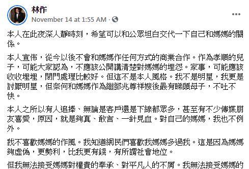 林作早前在社交平台打千字文,講到與媽媽劃清界線:「本人宣佈,從今以後不會和媽媽作任何方式的商業合作。作為孝順的兒子,可能大家認為,不應該公開講清楚對媽媽的埋怨。家事,可能應該收收埋埋,閉門處理比較好。但這不是本人風格。我不是明星,我更是討厭明星,但奈何和媽媽作為繼鄧兆尊祥嫂後最有睇頭母子,不吐不快。」