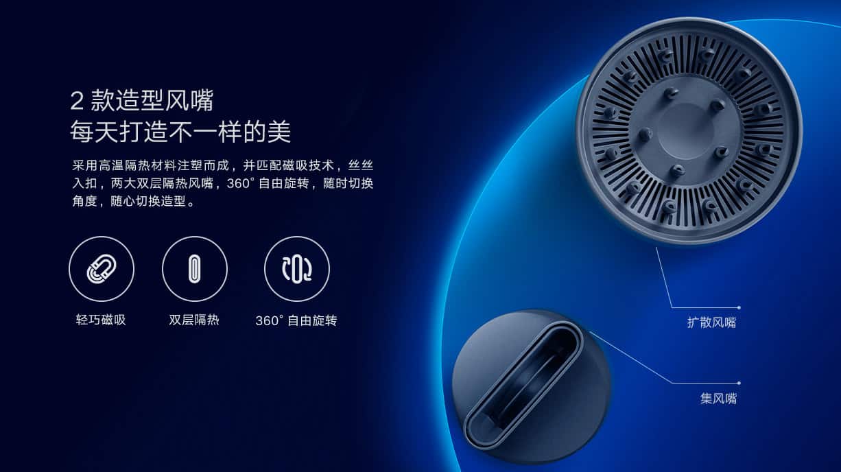 而其他方面的設計就與 Dyson 類似,包括使用玻璃珠熱力探測器和微處理器,據稱可以提供每秒 50 次智能溫度控制,而其最高風速達 60m/s,內置負離子生成器,可以配合半球結構提供強勁熱風同時不傷頭髮。
