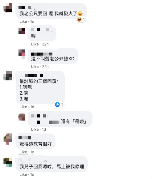 這篇貼文曝光後,立刻引起了廣大媽媽的熱議,紛紛留言說「我也超級討厭人家『喔』,喔三X」、「真的會讓人暴怒」、「其實有喔算好的了,我小孩都給我已讀不回」,「我兒子上次也回我『嗯哼』,馬上被我修理」。另外,大家也很認同原PO老婆的作法,「觀念對了,禮貌就有了,不然凡事一副大家欠他的,確實不太好」、「禮貌真的很重要,說『好』都贏過那些什麼嗯啊喔」、「我爸每次呼喚我,我回『幹嘛?』,他就會說,要回什麼事、怎麼了,幹嘛很難聽」。