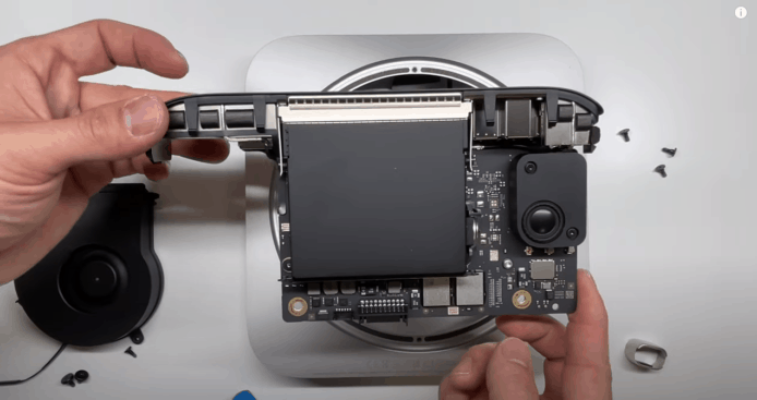 有外國網民在論壇上展示新款 Mac mini 的拆解過程,並直接地展示了全新的 M1 處理器。在對比 2018 年的 Mac mini 後可以發現 M1 使用了 DRAM 而非獨立的 RAM 插槽,因此可以減少底板尺寸,但亦帶來無法升級 RAM 的後果。