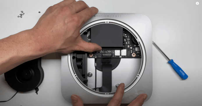 但是在拆解後見到升級為 DRAM 也意味著無法像以前的 Mac mini 那樣升級 RAM,因此在 Apple 官網上進行選購時,用戶便需要根據實際需求選擇 8GB 或者 16GB 的內置儲存空間。而其 SSD 也焊接在底板上,因此在儲存空間方面同樣無法升級。