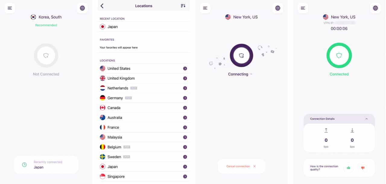 以 iOS 為例,在安裝之後其介面可說是非常簡單,只需要按下中間的連接按鈕,就可以自動連接到建議的伺服器,要選擇地區也只需要按下右上角的地球標誌,然後選擇地區即可,整個過程完全無需自行輸入任何設定,幾秒鐘內就可以完成 VPN 連接,對於新手而言可說是完全沒有負擔。