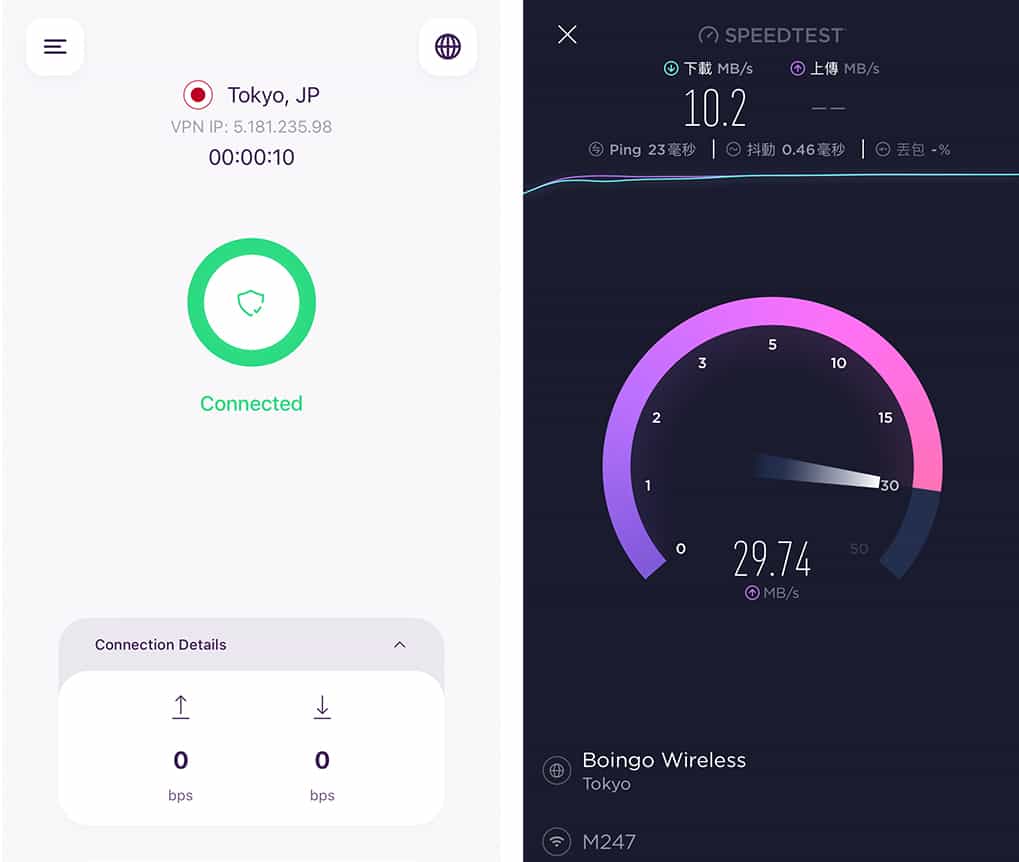 日本就近香港,除了 Netflix 有大量動畫之外,本身因為地理位置夠近所以速度也不錯,10.2 MB/s 的速度夠用有餘,23ms Ping 也可以提供流暢的打機連線。