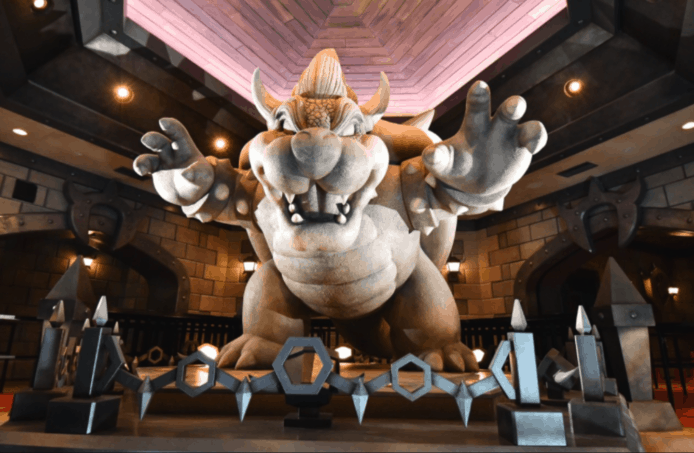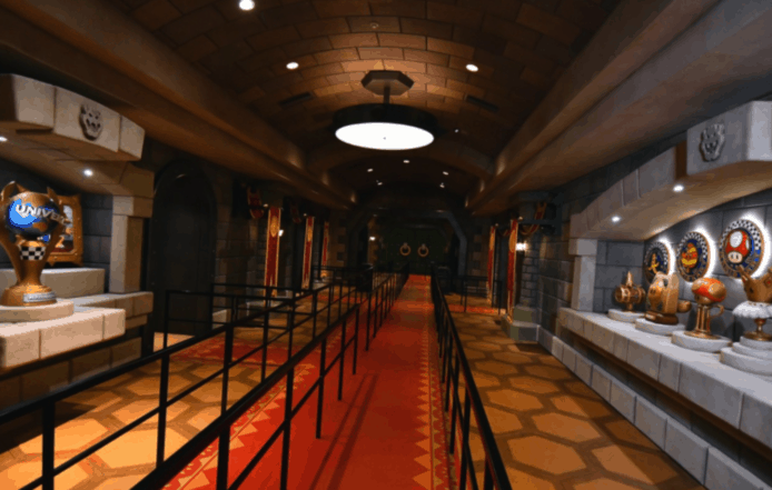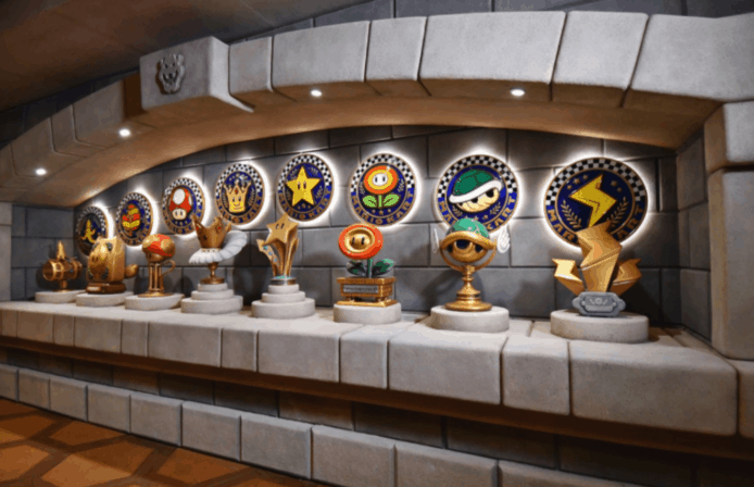 而在新展館中除了展示了玩家將來乘坐的馬里奧賽車之外,亦有長示一座巨大的庫巴雕像,官方亦為玩家準備了多種遊戲中熟悉的獎杯,只要於現實中獲得好成績同樣可以拿到各種實體版獎杯,令玩家更有代入感。