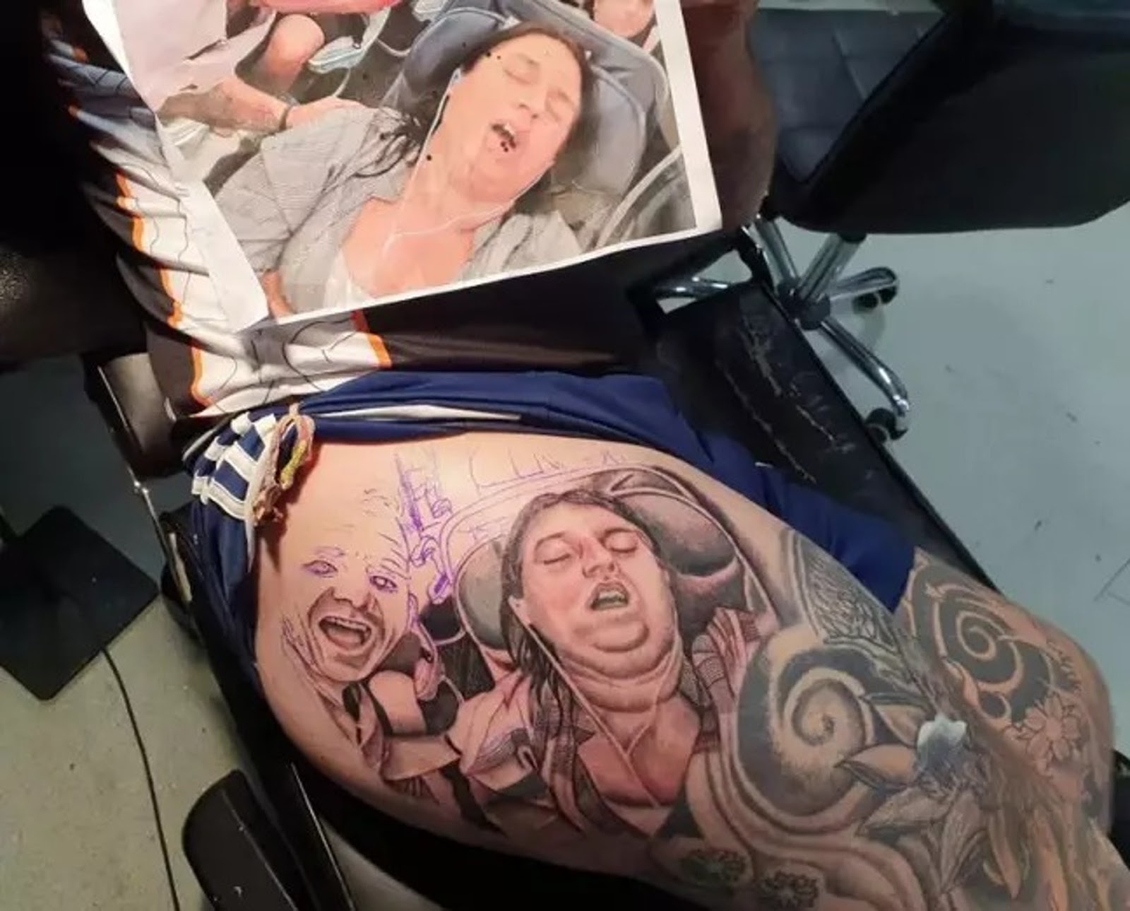 James為了把老婆糗樣刺在自己的大腿上,大手筆砸了300英鎊(約新台幣11210元),並在長達8小時的刺青過程中,要求師傅替老婆多上幾層雙下巴。隨後更是播了電話,誆老婆自己忘了帶信用卡,請她幫忙送過來。結果當Kelly帶著小朋友抵達現場時,看到老公身上的刺青也著實嚇了一大跳,一旁的小孩則是被老爸的超狂行徑給逗得哈哈大笑。