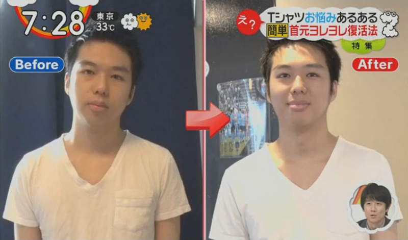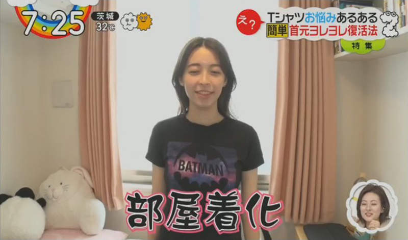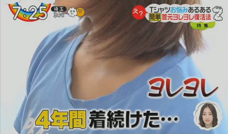 日本節目「 ZIP! 」先是在街頭訪問路人,許多人都表示自己超愛穿T恤,但領口鬆垮的問題都困擾著他們。像這位男生就拿出一件鬆垮垮的T恤,直說這是自己的睡衣;另一位女生也說,自己只敢在家裡穿T恤。