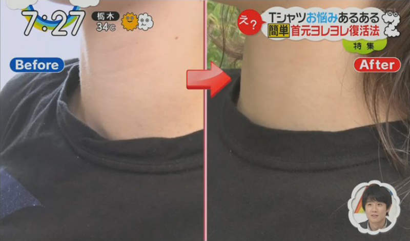 接著節目組就找到洗衣專家神崎健輔,他表示T恤的領口之所以會變鬆,無遺是在曬衣服的環節上出了問題,因為棉質的衣服如果不好好晾曬,很容易就會變形,不過大家不用擔心,只要簡單幾個步驟,就可以讓最愛的T恤恢復原樣!