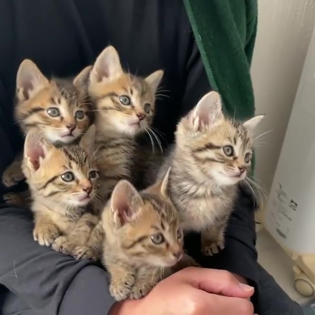 當時二宮小姐的先生將5小喵通通抱在懷裡,而她則負責逗弄5寶和錄影,只見牠們好奇滿滿地盯著二宮小姐手上的目標物,毛茸茸的小腦袋瓜非常一致地隨著目標物忽左忽右、搖擺點頭,而牠們5隻同步行動,萌度不只5倍、根本已經上升到5的N次方了~實在可愛到炸啊!影片po出後真的把人給萌得不要不要的www