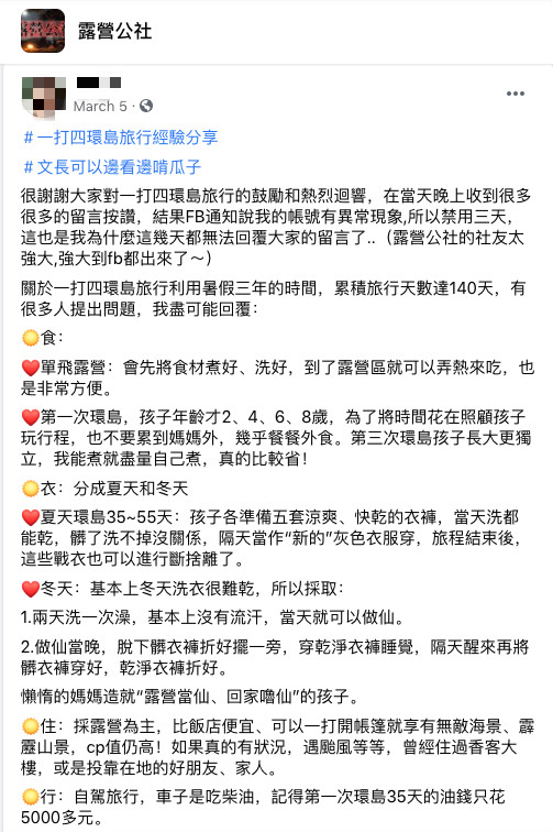 她表示,其實一打四並沒有大家想像中那麼難,還記得第一次環島時,因為孩子年齡還小,為了將時間花在照顧孩子、玩更多行程上,他們幾乎餐餐外食,直到第3年孩子終於長大,也變得更加獨立,她才開始盡量自己煮,確實比較省錢。她還透露,雖然開車環島,看起來好像很貴,但記得第一年的油錢,35天也只花了5000多元。
