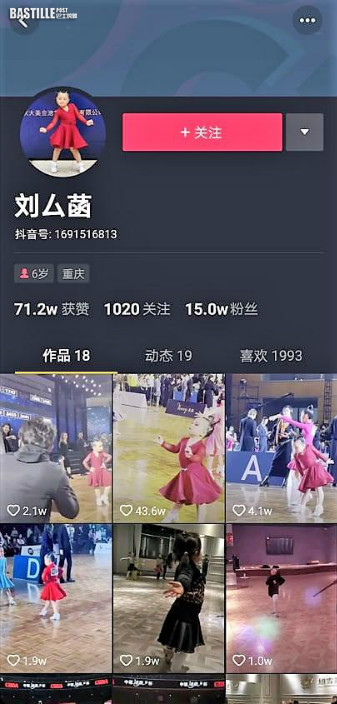 近年來越來越多小朋友開始接觸拉丁舞。而內地有位年僅6歲、來自重慶的小女孩劉厶菡,雖然僅僅學了一年的拉丁舞,卻因為天賦異稟跳得相當出色,被老師選中參加第「第34屆CBDF中國國際標準舞錦標賽」,當日她身穿一身亮眼的紅色秀服出場,與其他專業的拉丁舞選手一較高下,其賣力的舞姿和全情投入的表情,瞬間成為全場最大的亮點,並紅遍網絡!