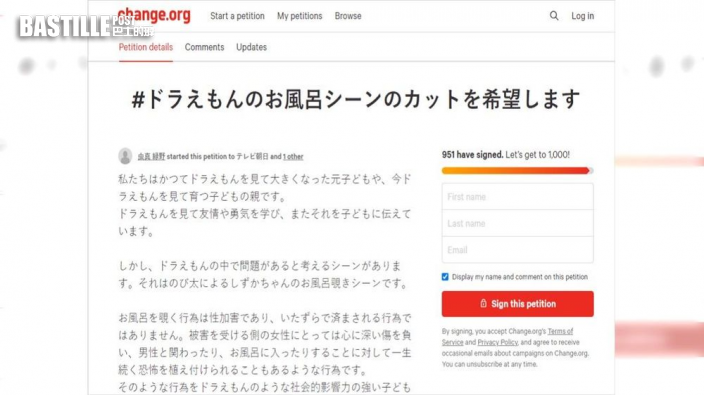 這位日本網友虫真綠野透露小時候也是《多啦A夢》的忠實擁躉,對於故事內容經常出現靜香春光外洩的鏡頭不以為意,更習以為常;直到自己長大為人父母,才發現這些畫面很有問題,簡直是教壞小朋友。因此她在網站「Change」就此事發起聯署。