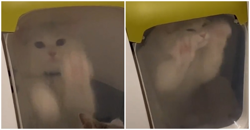 影片中可以看到,小白在貓砂屋裡面拼命對著透明塑膠隔板揮動毛毛小手,激動的樣子似乎是在求救!發現動靜的小灰下去查看,還用手推了推隔板的下緣,就好像在告訴小白:「從這裡推開就好了啊~」小灰後來甚至還將自己的手伸進去試圖抓住小白,但相信牠心裡應該已經翻了無限個白眼了吧XD
