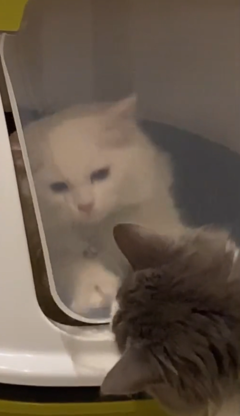 不會開門被關在廁所裡這種事情,被人家發現了真的會很糗!國外一位飼主養了一隻白貓和一隻灰貓,某天小白到貓砂屋裡面上廁所,但不知道是想要求關注還是突然忘記要怎麼出來(?)居然就這樣卡在裡面老半天,直到小灰終於看不下去了!