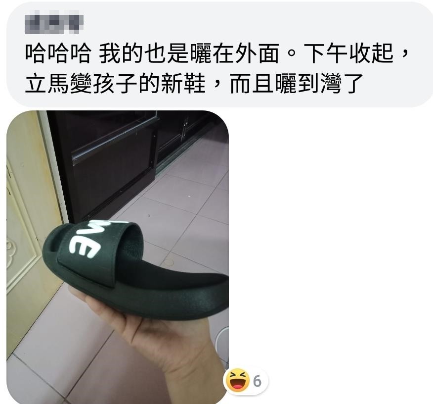 這篇貼文曝光後,釣出了許多有過同樣遭遇的苦主,紛紛留言說「我也有一雙被熱到縮水的」、「布希鞋也會縮水,有一次小朋友不小心尿濕,我洗完後拿去陽台曬,最終就再也穿不下了」、「原來不是只有毛衣烘乾會縮水」、「我也是把鞋子曬在外面,結果收回來直接變小孩的新鞋,還曬到變形」、「原來拖鞋買太大可以拿去曬一曬」。