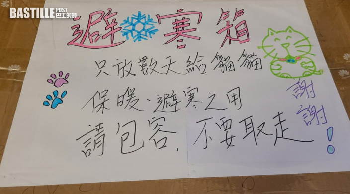一名網民於Facebook群組「天下貓貓一板貓群組」上分享,指自己與太太合力製作了一個「避寒紙箱」供附近的流浪貓入住,「希望為貓貓們添一點點暖意」,紙箱上寫有「只放數天給貓貓保暖避寒之用,請包容,不要取走」。網友更邀請家中的兩隻貓率先試用。