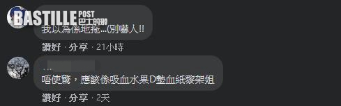 相片上載不久,就已經嚇親不少網民,「好似鼻涕蟲」、「咁肥嘅蟲」,但原來網民並沒有仔細看清,樓主表示那是一條「好似毛巾碎既野(嘅嘢)」,亦有網民看完後指:「唔使驚,應該係吸血水果D墊血紙黎架姐」。