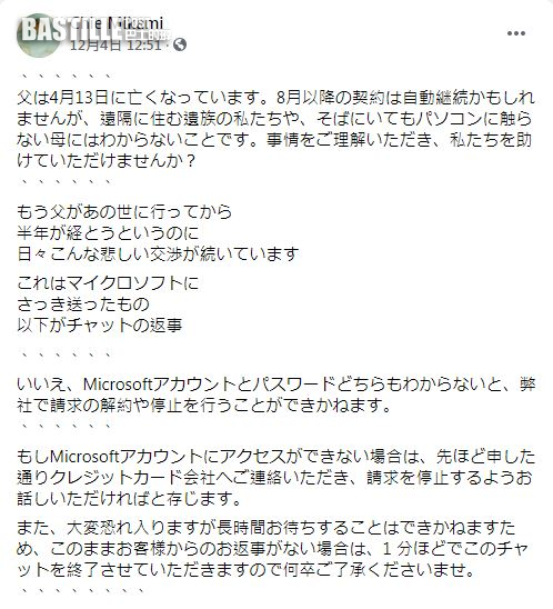 曾拍攝紀錄片《被瞄準的村落》的導演三上智惠4日於Facebook發文,指父親於今年4月病逝,但她在8月時發現有不少企業仍在徵收「父親」的各種費用,包括Spotify、收費電視、電話費、會藉年費等。三上曾向有關企業反映,但對方只是官腔地回應指「須本人確認」、「需要帳號密碼」,三上怒斥這些企業冷血無情,是「從死者上搶走金錢」。