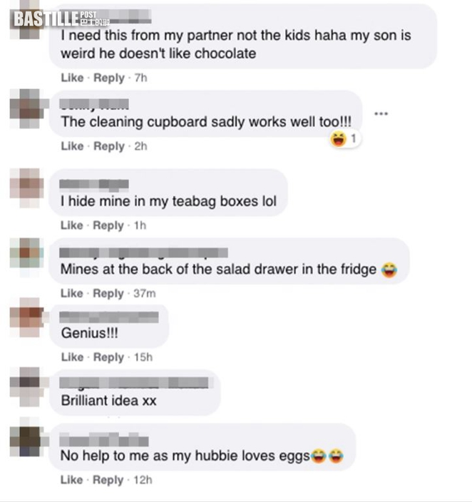 外國疫情仍然肆虐,多地再度實施封城令,家長與小孩共處一室,想一個人好好享受吃朱古力減壓也有困難!一位媽媽Jenny Hourd日前在Facebook群組「Family Lockdown Tips and Ideas」中發文分享「育兒秘訣第一條」,並上載圖片顯示她將兩排朱古力橫放收藏在雞蛋盒中,以防他人「盜去」。