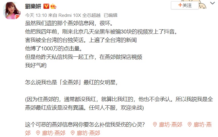 劉樂妍還補充,在事發之後,近期「燕郊信息網」竟然還私訊要一起工作跟拍影片,「真的好氣」,劉樂妍還強調,自己在怎麼說也是全燕郊最紅的女明星,因為通常住燕郊的,都沒有很紅,所以擁有「燕郊最紅女明星」的封號當仁不讓,「這個可惡的燕郊信息要怎麼補償我受傷的心靈。」