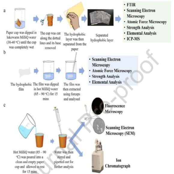 研究人員進行了實驗,並通過掃描電子顯微鏡確認了塑膠微粒被釋放到實驗所使用的超純水中。一個一次性紙杯暴露在高溫液體中 15 分鐘將會產生大約 102 億個亞微米大小的顆粒。而更驚人的發現是,在杯內塑膠薄膜的分析中發現當中存在重金屬。