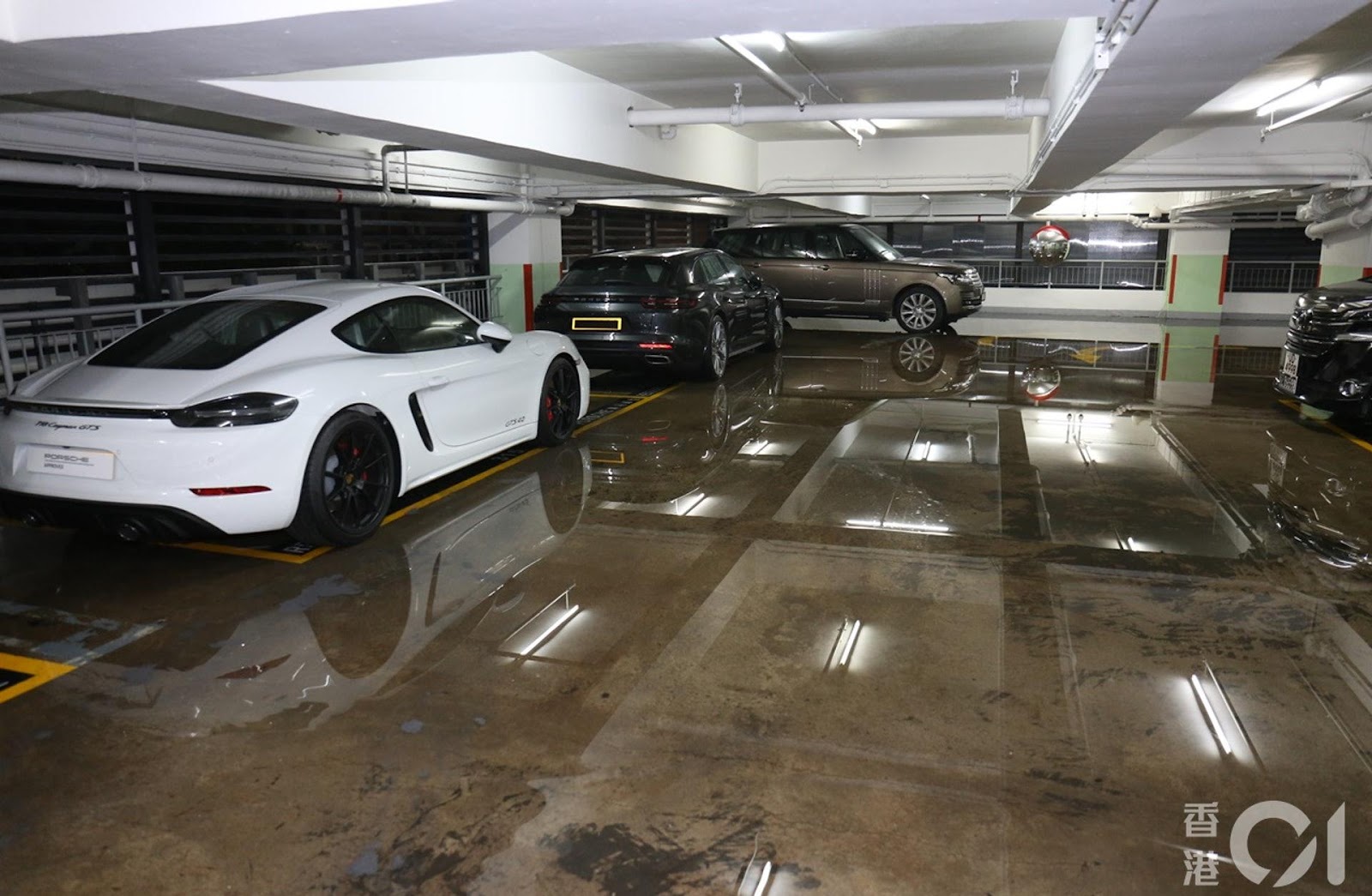 消防射水撲救期間,鄰近資本中心停車場受影響,有保時捷名車被濺濕及沾有灰燼。(劉定安攝)