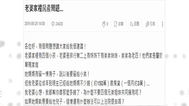 男網友表示,老婆最近聽到,媽媽決定之後,要把這棟房子,全部留給最小的弟弟,其它的女兒都不能住在這,讓老婆不解,既然大家都有繳錢,為什麼不四姊弟一起共用就好,非要留給弟弟?