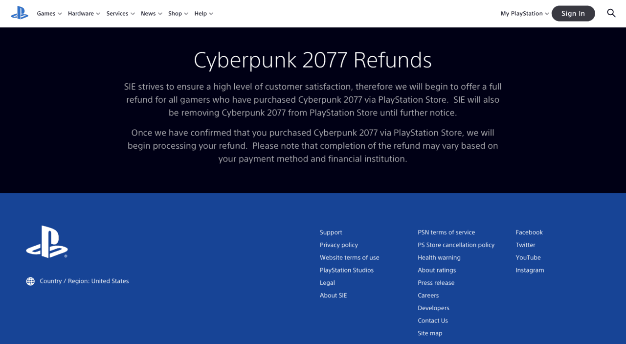 SIE strives to ensure a high level of customer satisfaction, and we will begin to offer a full refund for all gamers who have purchased Cyberpunk 2077 via PlayStation Store and want a refund. Please visit the following link to initiate the refund:https://t.co/DEZlC0LmUG.