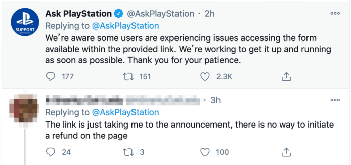 而其遊戲平台 PlayStation Store 亦在今日(12月18日)約早上 9 時於 Twitter 表示,會為《 Cyberpunk 2077 》的玩家提供退款,玩家可以透過其連結申請退款,但是有不少網民表示,無法登入其退款頁面,其後,在約早上 11 時,PlayStation Store 就表示已察覺到用戶無法登入其連結,現在他們正在努力盡快啟動其網頁,感謝用戶的耐心等待。亦有網民留言質疑,其平台發帖是否意味,玩家想繼續玩其遊戲,之後都無法等到遊戲問題修復計劃,亦有網民留言,認為其公司退款決定「好」,因為對於其遊戲的問題感到「厭倦」。