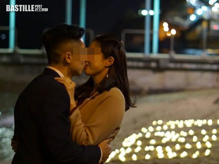 天色漸黑,港男子手持數個紅色心形氣球,站在已砌好的「MARRY ME」上方靜候。不久後,一名女子手持一大束紅色玫瑰花走近,兩人期後便開始深情擁吻,羨煞旁人。