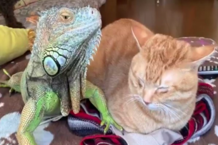 純天然毛梳!橘貓「狂蹭刺刺鬣蜥」整隻停不下來:太爽啦~