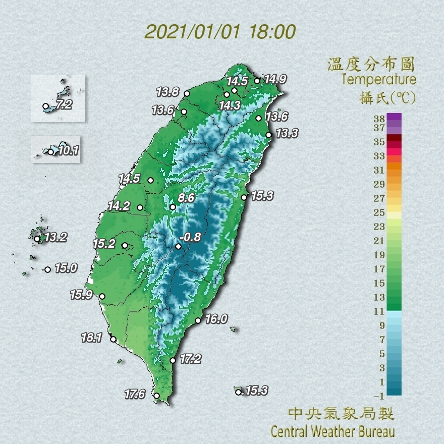 中央氣象局表示,今天起寒流逐漸減弱,清晨低溫約10至13度,雖然比昨天略為回升,但感受上仍然偏冷,預計今天晚上至明天清晨由於輻射冷卻效應,西半部地區仍有局部10度以下的低溫出現,務必要做好保暖措施。