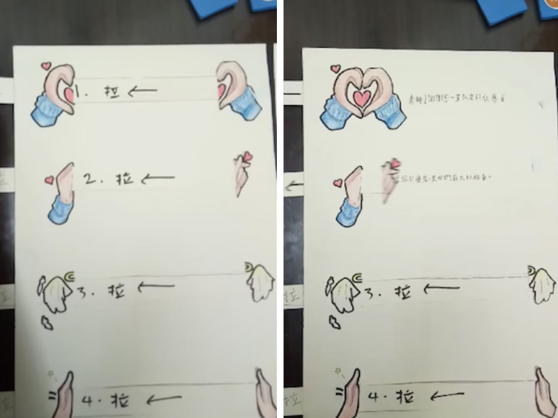不料過了幾天,原PO再次上傳女兒的新作品,而這次除了繪畫,更令人佩服的是滿滿的創意。原PO表示,因為女兒就快小學畢業了,所以就想給老師做感謝卡。從影片中可以看到,雖然說是卡片,但上面很用心的做了許多小機關,像是原本左右兩邊隔著一段距離的圖案,在經過拉扯後,竟然會二合為一,成為一個手比愛心的樣子。另外還有一個看似2D的人物,其實眼皮是可以活動的,只要在下方輕輕一拉,眼睛就會做出眨眼的動作,真的非常神奇!
