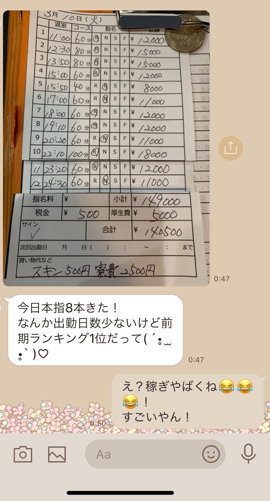 不過結算單也詳載了驚人的工作時數與接客量,從早上11點至半夜12點半都必須「不停運動」,加上一天接客12次就要洗12次澡,幾乎沒有吃飯或休息空檔,都讓日本網友大嘆:「很耗體力」「身心靈都算是重度勞動」「只能短期做一下吧?」