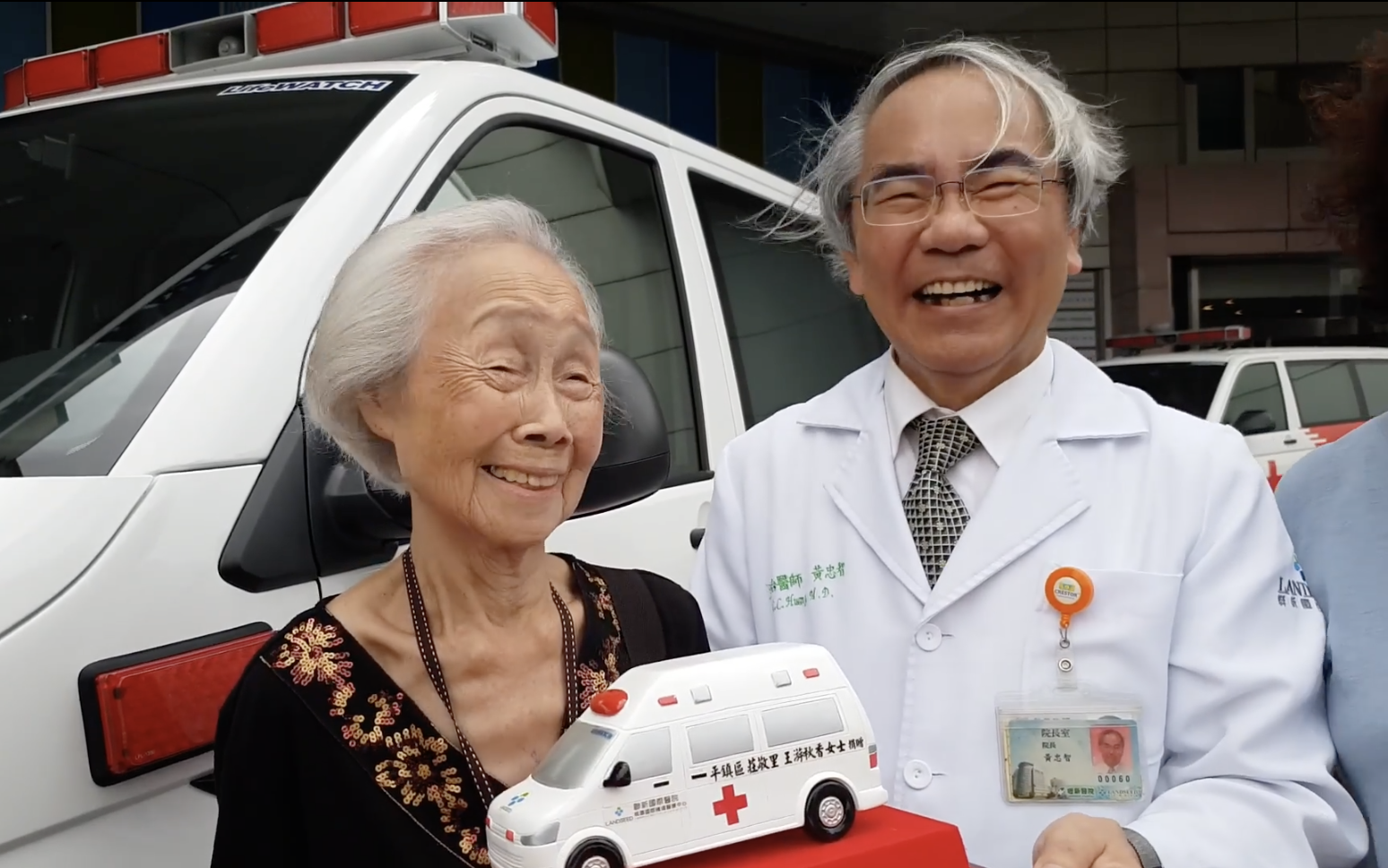 ▼在醫院志工的引薦下,阿嬤將救護車捐給了桃園的聯新醫院。醫院為了感謝她的付出,特別在車身上印她的名字,並贈送給她救護車模型以示感謝。看著自己打拼而來的救護車,阿嬤忍不住落淚,說:「我任務完成了,沒什麼事了。」