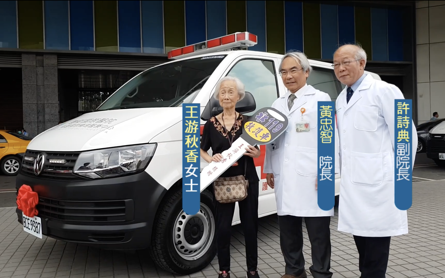 ▼黃忠智院長從阿嬤手中接過救護車鑰匙,接受捐贈,並感謝王游秋香女士對醫院的信任和肯定。他表示醫院必將不辜負這份善心與大愛,盡力救治照護好每個來院的病人!