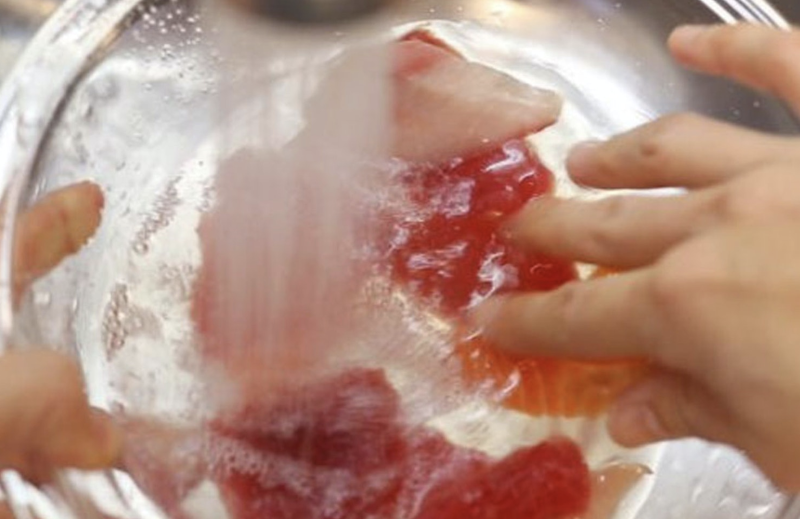 ▼將刺身放進碗中,用清水洗乾淨。用水把刺身沖洗乾淨,能夠輕易解除「三甲胺」形成的魚腥味;
