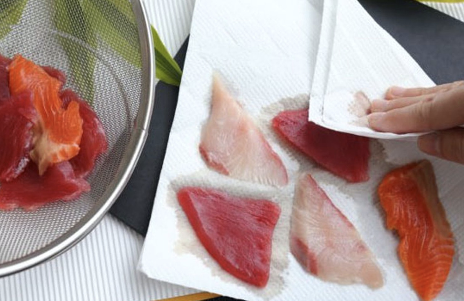 ▼取出廚房紙巾,印走刺身上的多餘水分。灑上清酒和鹽,輕輕揉搓刺身。清酒中含有「羰基」的成分,能夠抑制導致魚腥臭的「三甲胺」;