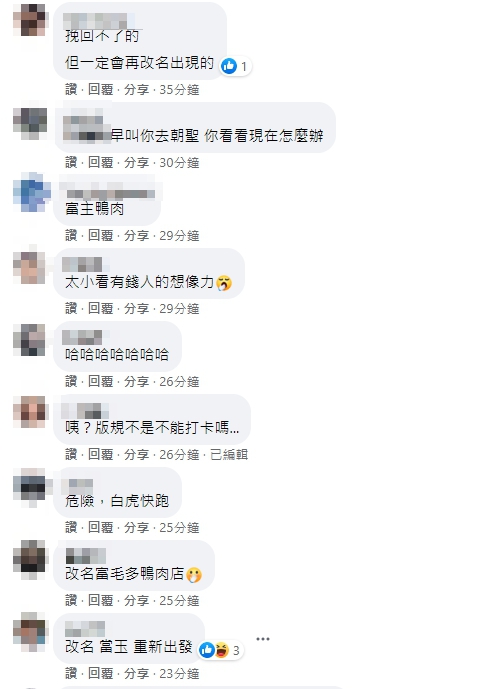 該篇文章曝光後,不少網友紛紛留言表示,「自己搞倒的」、「改名繼續賣」、「可能毛長齊之後才會開吧」、「看來新毛王鴨肉即將崛起」、「會改名繼續開的啦」、「這個點這個時間應該不會有人笨到去頂這家店,除非他不是做吃的」、「換個名字又是一尾活龍」、「太小看有錢人的想像力」、「我是建議繼續營業,齊毛的人可以享有優惠」,「都關店了,放過人家吧」。