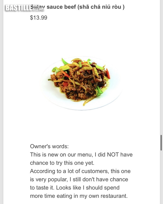 從她上載的照片可見,老闆介紹孜然牛肉時寫道:「有一點辣但很好吃,我們之前會用竹籤串牛肉,但有幾個客人以為竹籤也是食物的一部分,不慎刮傷了嘴唇(他們一定看過介紹奇怪中華料理的節目),所以我們現在不用竹籤,改用洋蔥拌炒(洋蔥是可以吃的),大力推薦!」