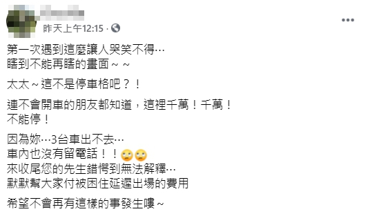 ▼白色轎車內沒有留下聯絡方式,其他車主無奈報警,這才聯絡到車主的丈夫。對方趕來時同樣一臉錯愕,只能默默掏錢幫大家付延遲出場的費用。原po說:「太太~這不是停車格吧?!」、「瞎到不能再瞎。」