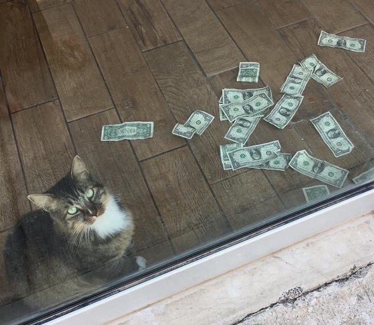 ▼原來這間辦公室位於繁華的地段,每天有很多人從門口經過。路人隔著玻璃門看到CASHnip,就將鈔票塞進門縫逗牠玩,結果貓咪一下子就把鈔票搶走了。久而久之,經常有人故意拿鈔票來逗CASHnip。