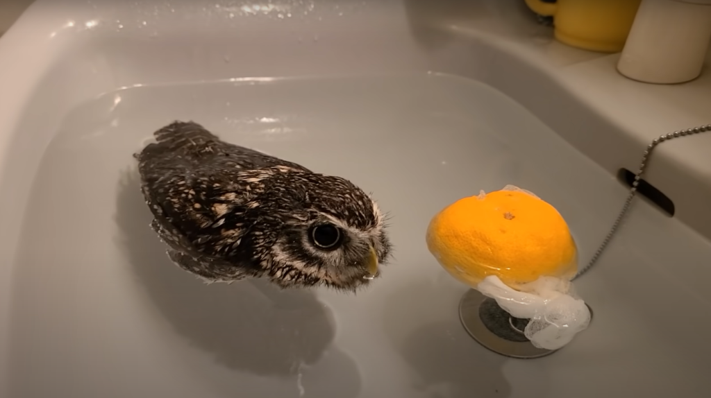 影片中可以看到這隻小貓頭鷹從洗手台開始加水的時候就非常淡定,隨著洗澡水越來越多,居然還跟著水流在水面上轉圈圈,而等到水終於放滿後牠就像浮木一樣安穩地漂浮著,那放鬆的神情看起來相當享受,其實牠根本就是水棲動物吧?!