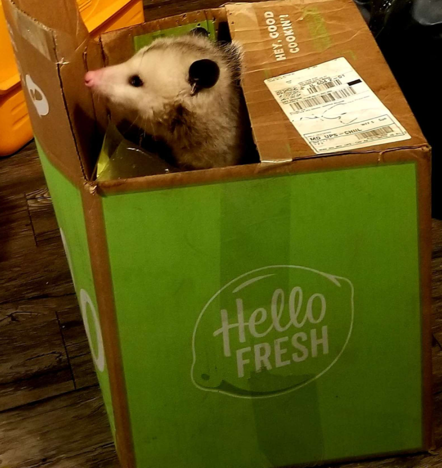 這天傍晚,格蕾琴訂的快煮餐一如往常般送到她家門口,她想說暫時把那一箱食材先放在門廊上,等清好冰箱再拿進來,但她萬萬沒料到有個聰明的小偷就趁這個時候「搶先開動」,把即將成為格蕾琴一家人晚餐的食材、能吃的都吃了,還剛好被格蕾琴逮個正著,原來就是隻路過的野生負鼠!被抓包的牠還從紙箱中探出頭來,一臉無害地和格蕾琴對望:「謝謝妳的招待耶~」讓格蕾琴又驚又喜、哭笑不得。