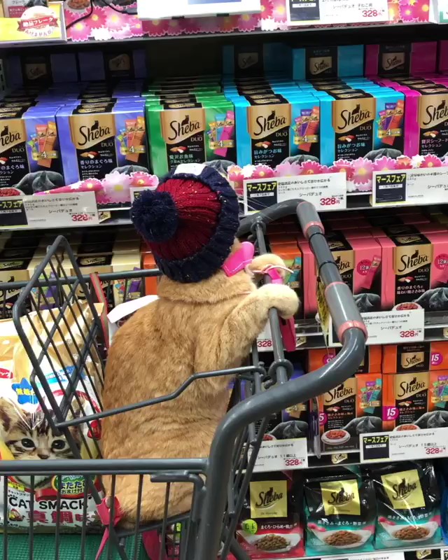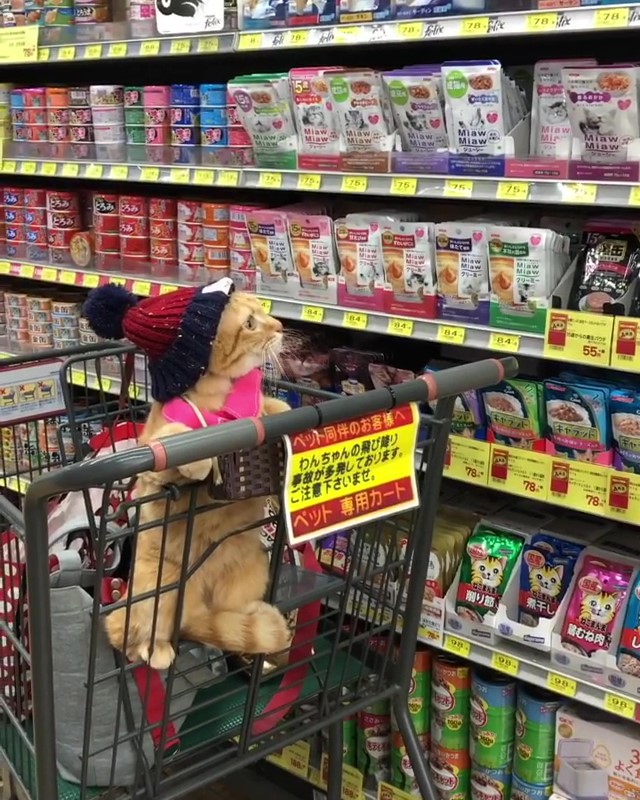貓咪乖巧地坐在購物車上認真挑罐罐的模樣可愛到超過了!面對這麼可愛的喵咪,不管牠看上了哪些罐罐,主人都會甘心情願地帶回家吧!