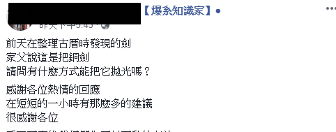 據《三立新聞網》報導,有網友在臉書社團「爆系知識家」發文說,在家裡的古厝大掃除的時候,赫然發現家裡面竟然放了一把,銅製的古劍,從外觀看上去,已經佈滿銅鏽,他想說整理一下應該也是個好東西,就想要先拋光處理,便拍下照片PO上網路,問大家:「請問有什麼方式能把它拋光嗎?」希望可以看到這把古物以前的模樣。