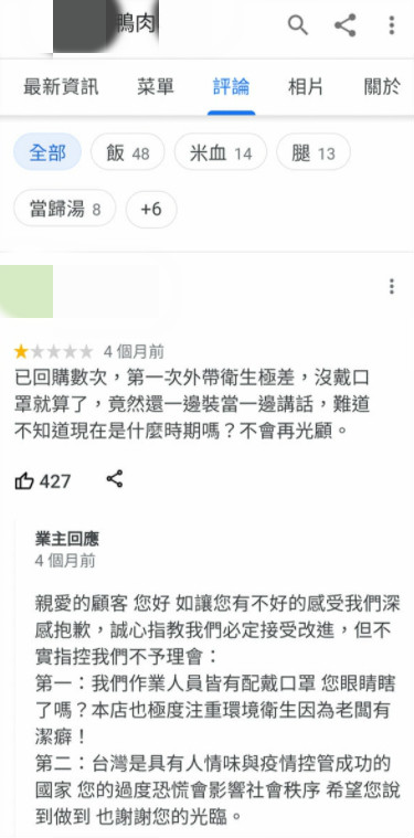 然而,如今風波持續擴大,就有網友發現,4個月前曾有一名網友在Google評價上留下1星評論說,「已回購數次,第一次外帶衛生極差,沒戴口罩就算了,竟然還一邊裝當一邊講話,難道不知道現在是什麼時期嗎?不會再光顧。」儘管該條評論已在Google刪除,但早已被網友截圖瘋傳到爆怨公社。